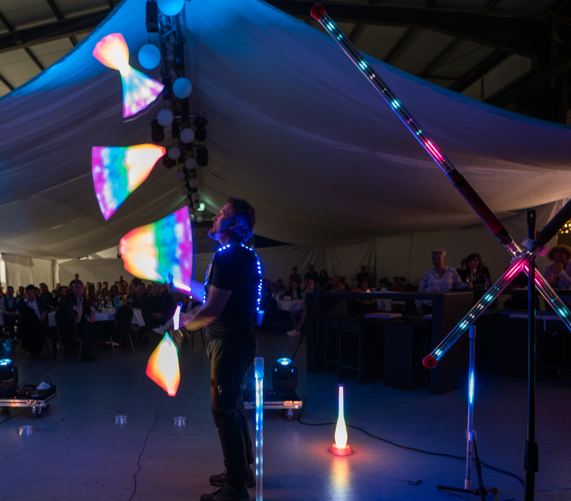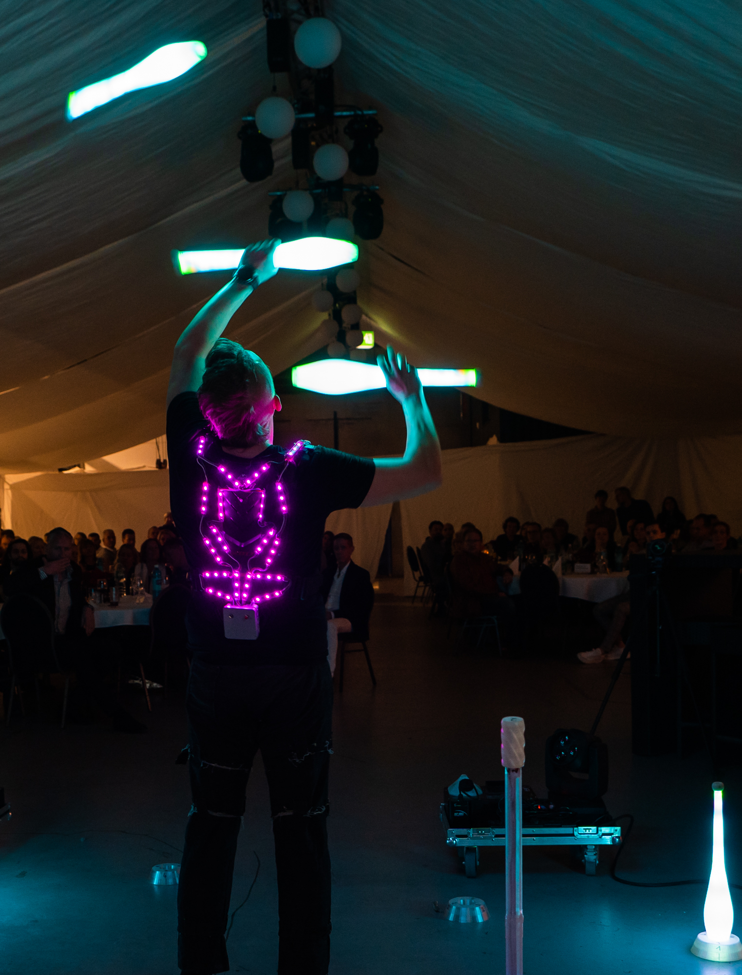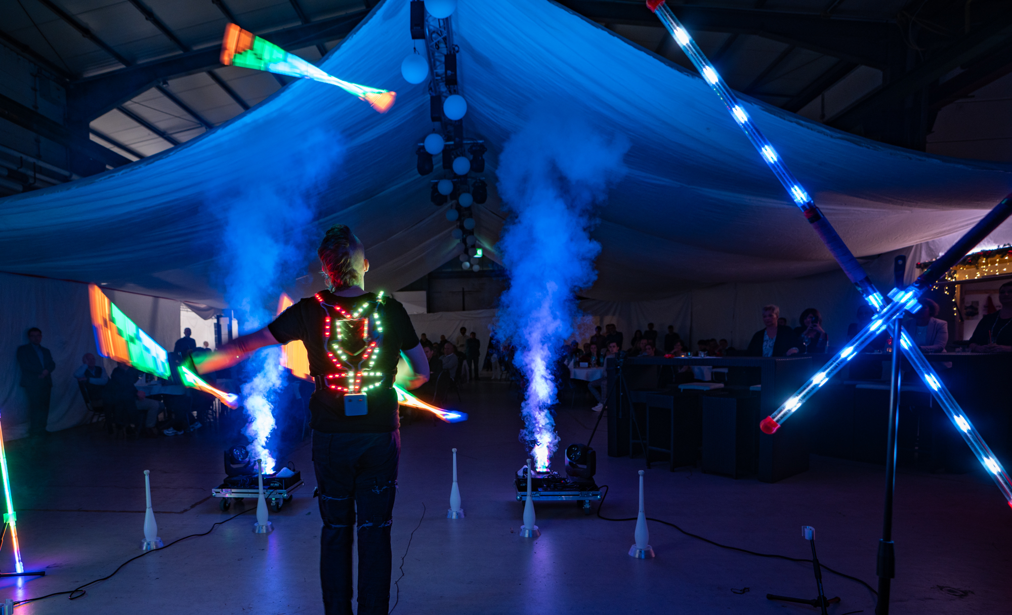 Mit jeder Bewegung verschmolzen Licht, Musik und Raum zu einem visuellen Erlebnis. Die LED-Requisiten zeichneten leuchtende Muster in die Dunkelheit, formten Wellen, Spiralen und Figuren, die im Takt elektronischer Musik pulsieren. Ein besonderer Moment war die Darstellung des Firmenlogos – ein kurzer, aber eindrucksvoller Augenblick, in dem die Marke des Unternehmens selbst Teil der Inszenierung wurde.